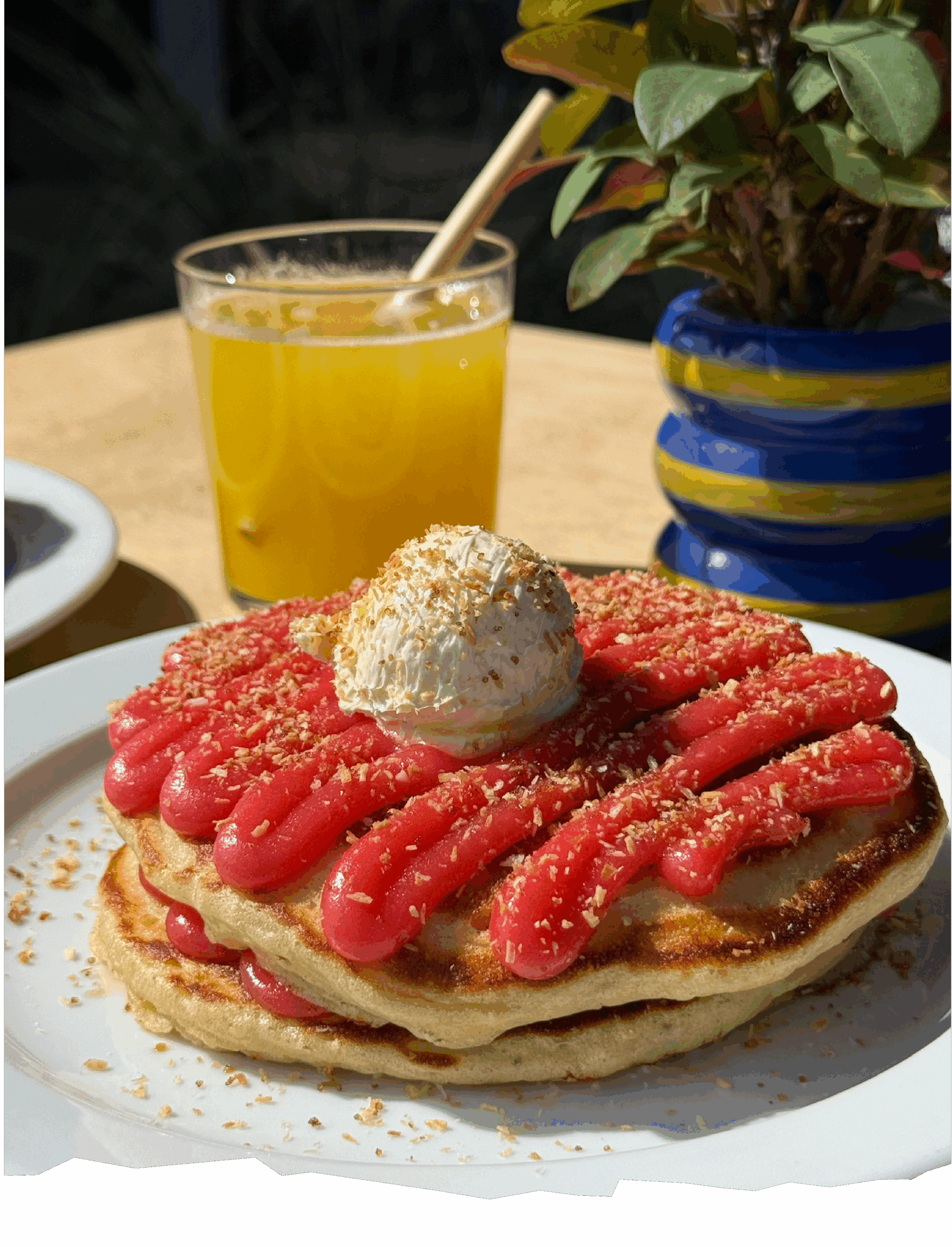 Fluffy pancakes met roze spread Ontdek de Dawet Pancakes van Young Harvest: luchtige pancakes met een romige, roze kokosspread geïnspireerd op de Surinaamse dawet.